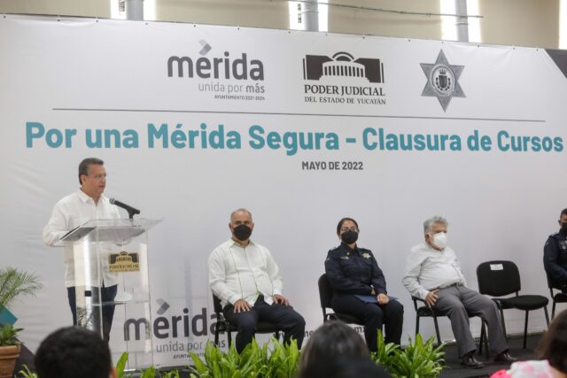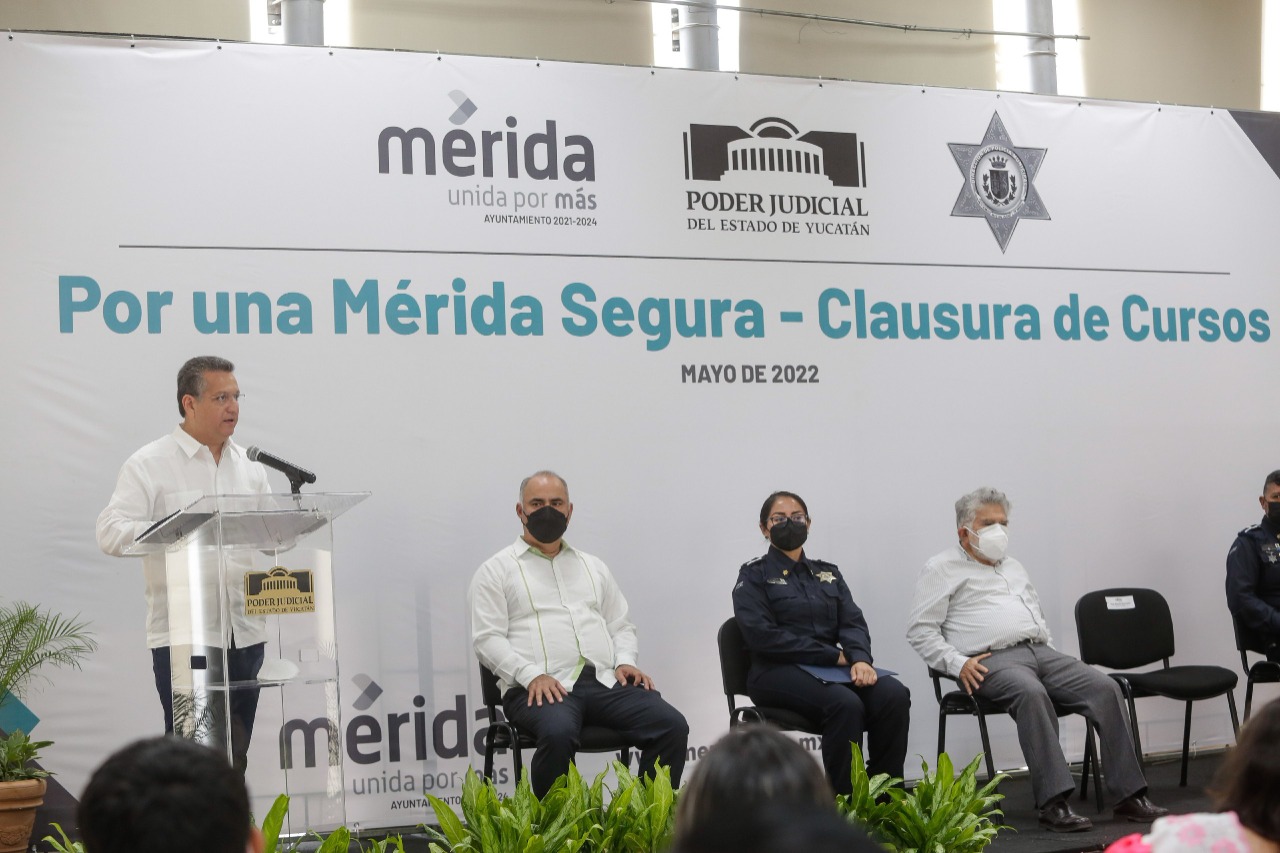 En su intervención, Luis Felipe Esperón Villanueva, magistrado de la Sala Colegiada Penal del Tribunal Superior de Justicia, explicó que como parte del Convenio Específico de Colaboración para el otorgamiento mutuo de capacitación se realizaron tres cursos de capacitación a personal de la Policía Municipal de Mérida, donde se han instruido a agentes de la Policía, jueces de paz, personal administrativo y mandos medios de la corporación.